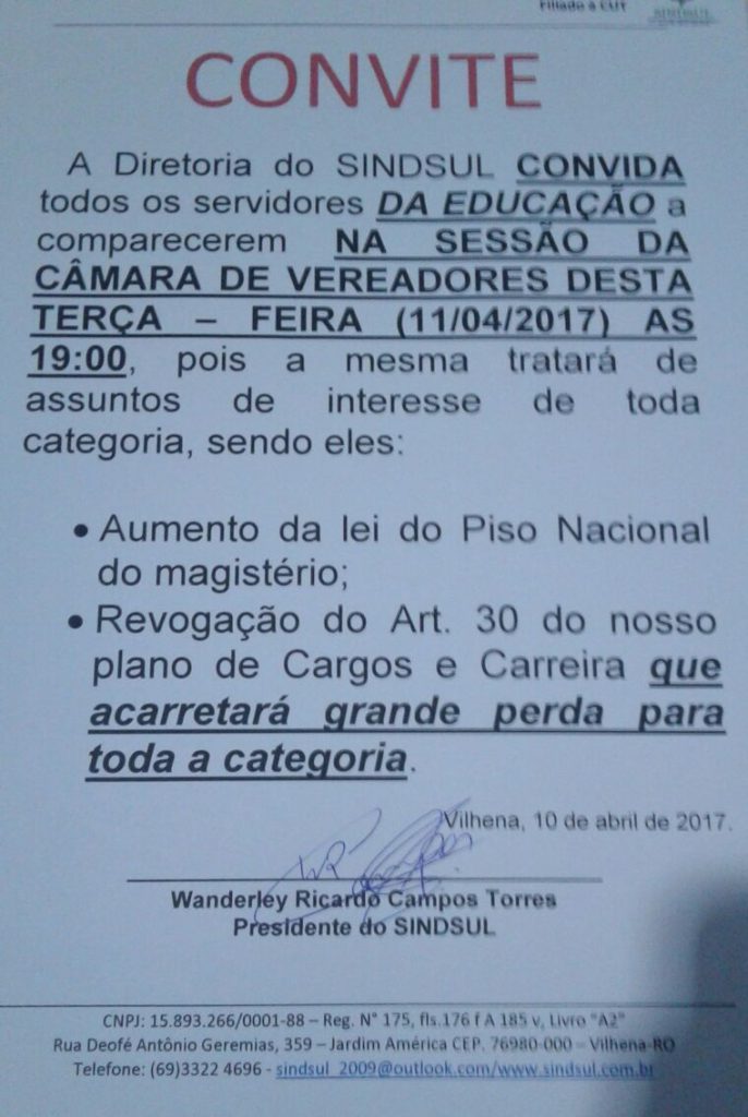 Na noite de 10 de abril de 2017, os representantes das escolas, juntamente com a diretoria do Sindsul, reuniram-se para deliberar acerca do Ofício nº 054/2017 , que foi encaminhado à Casa de Leis para ser votada em sessão que acontecerá nesta terça-feira, dia 11 de abril de 2017. Não concordando com as alterações constadas no ofício, estes representantes, juntamente com a diretoria do Sindicato encaminham Ofício solicitando cancelamento desta pauta, e consulta à categoria com fins de alterações em Leis, que atinjam a classe. Aproveitando para convocar os cidadãos para comparecerem à sessão nesta noite.
