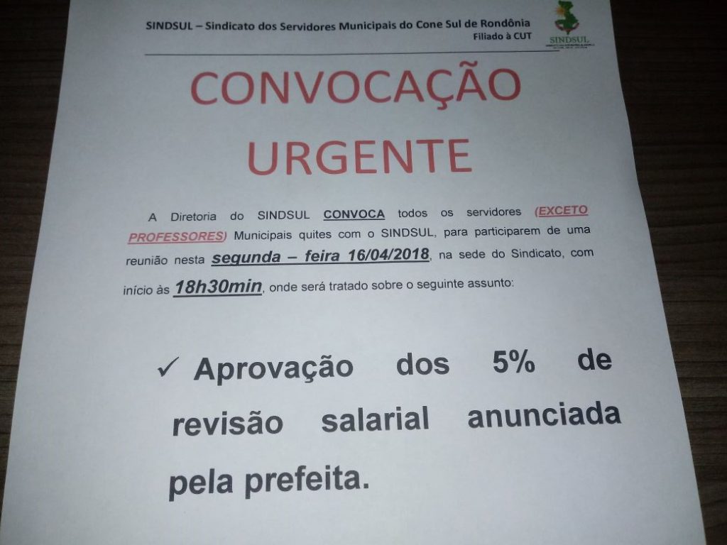 SINDSUL CONVOCA SERVIDORES PARA REUNIÃO URGENTE; APROVAÇÃO DOS 5% DE REVISÃO SALARIAL
